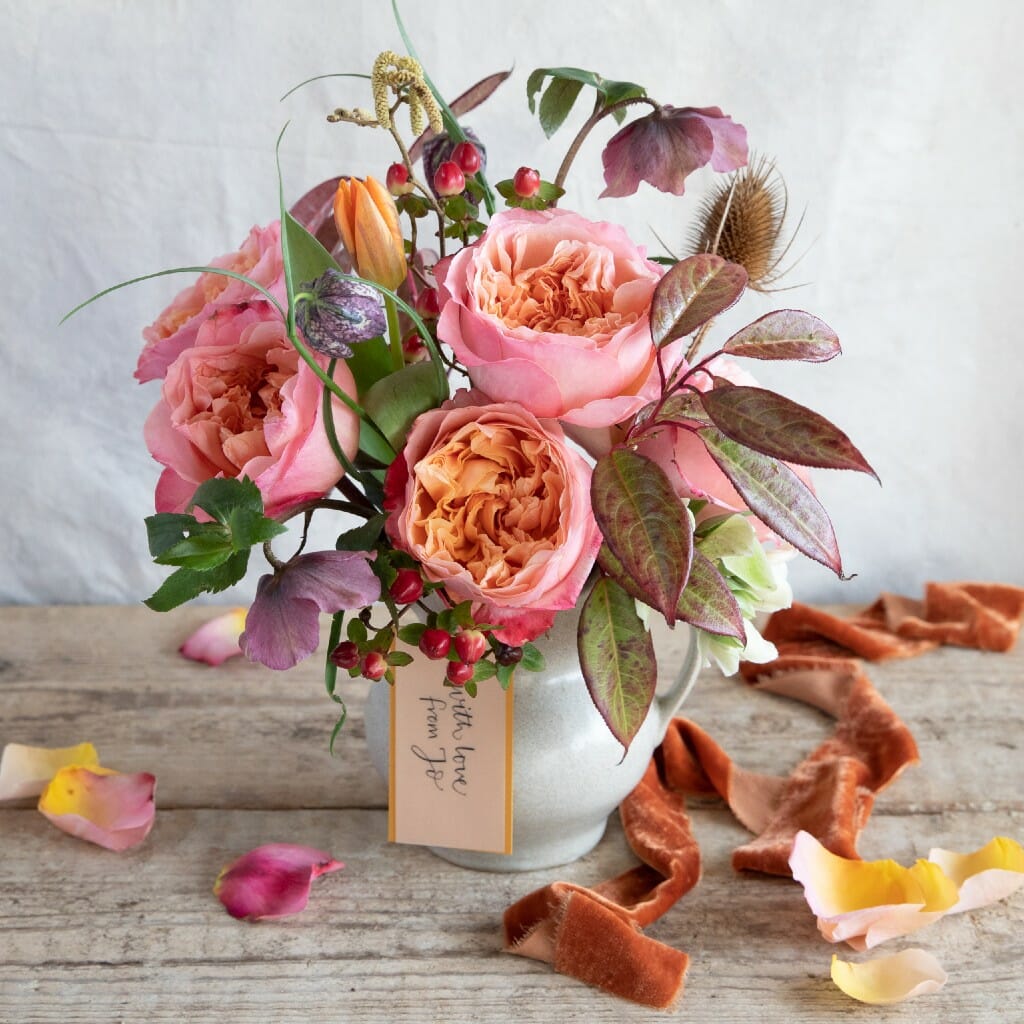 Edith opens from a cup shape to form a classic, quartered rosette.