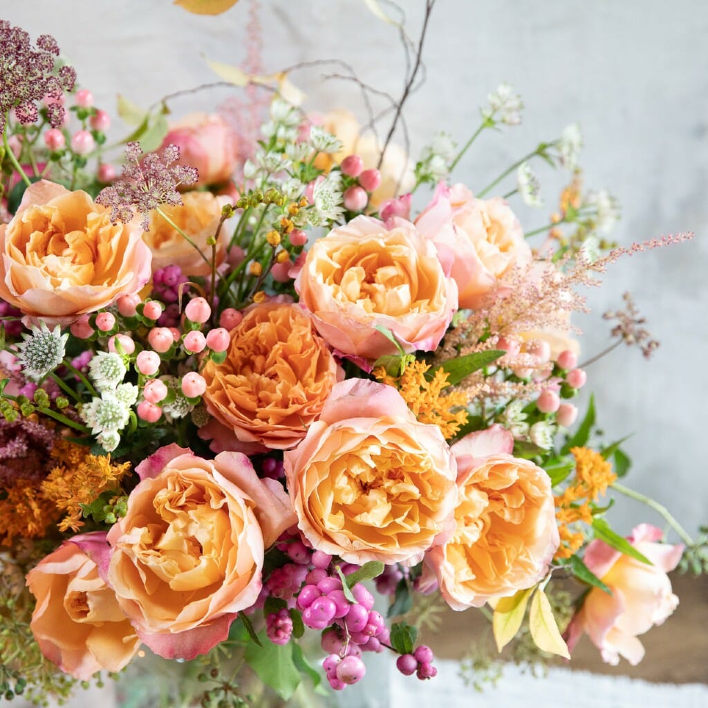 Playful Edith (Auspluto) offering blooms with unusual two-toned shades of apricot, gold, and yellow with a halo of soft pink outer petals. She is considered the wild card in the collection of David Austin Wedding Roses, with her vivid flamboyant personality. As Edith offers so much in the color department, she can easily be used with a variety of color palettes – adding the sunshine to summer floral centerpieces or a touch of buttery warmth to an autumn flower arrangement.